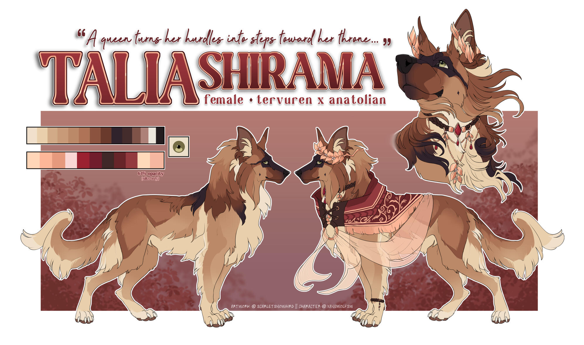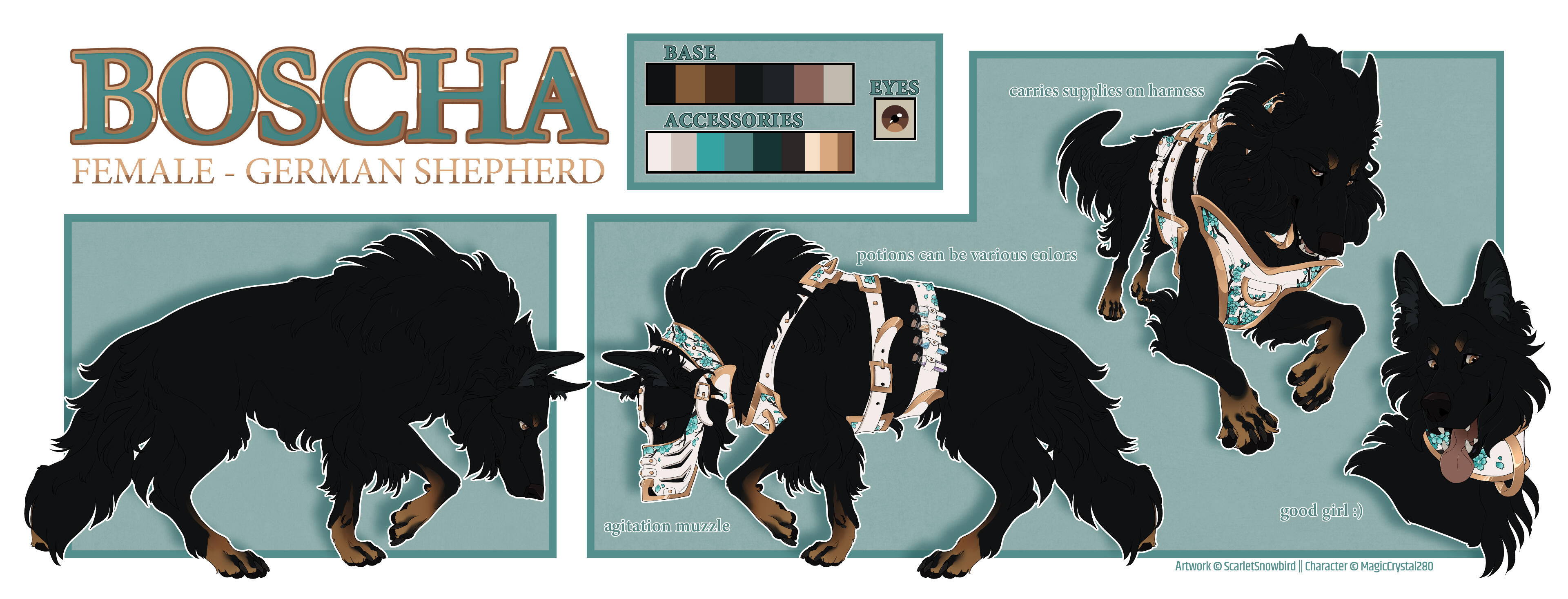 Status: ASKBy default, reference sheets include a fullbody view and a bust view, a color palette, and any pertinent text information you would like included (optional).At no extra cost, the bust can be substituted for two small "detail" views (such as eyes or accessory close-ups).Adding additional views/variations to a reference sheet will incur additional fees.